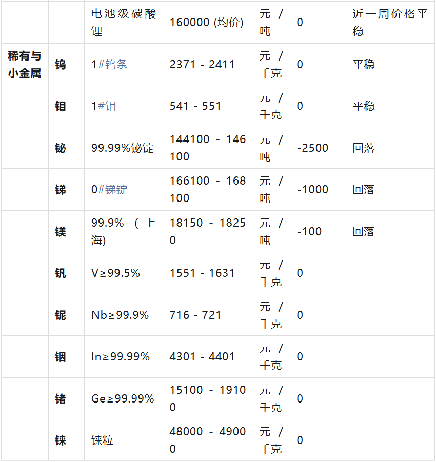 :在普遍上漲的行情中,鉍、銻、鎂等少數(shù)小金屬價(jià)格出現(xiàn)小幅回落。