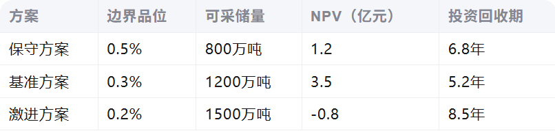 設置價格波動區(qū)間(±20%)、成本變動(±15%)示例:鐵礦當價格從800元/噸降至640元/噸時,邊界品位需從25%提高至28%
