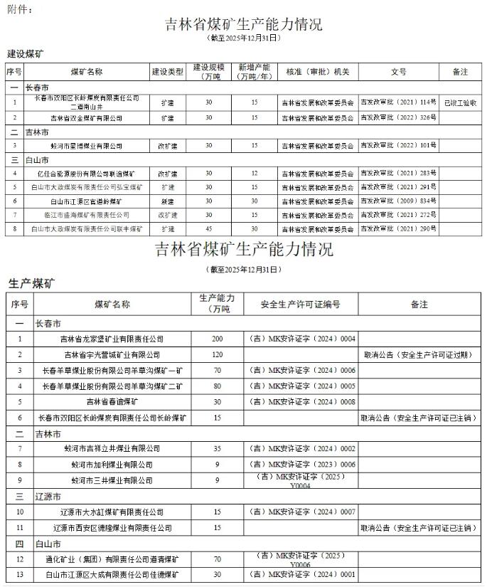 附件:吉林省煤礦生產(chǎn)能力情況(截至2025年12月31日)