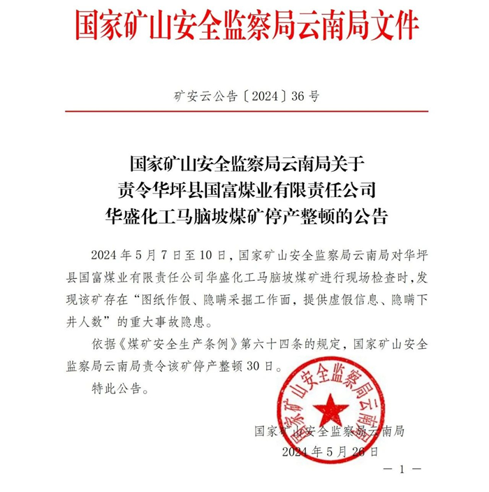 5月26日,國家礦山安全監(jiān)察局云南局發(fā)布《關(guān)于責(zé)令華坪縣國富煤業(yè)有限責(zé)任公司華盛化工馬腦坡煤礦停產(chǎn)整頓的公告》。