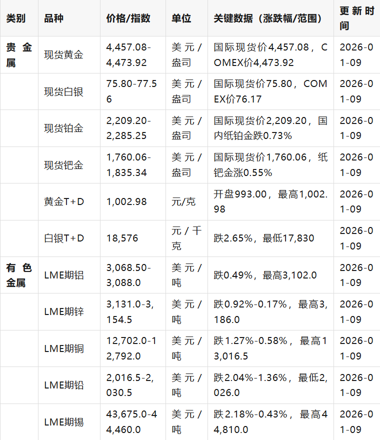 漲跌幅計(jì)算基于當(dāng)日開(kāi)盤(pán)價(jià)與收盤(pán)價(jià),極值標(biāo)注最高/最低交易價(jià),單位統(tǒng)一為國(guó)際通用計(jì)量單位(美元/盎司、元/克、元/噸等)。